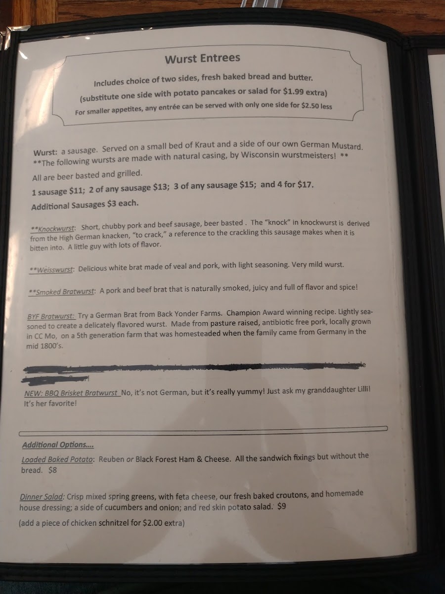Any one Wurst cooked accordingly, served with Kraut, saltine crackers and German mustard.